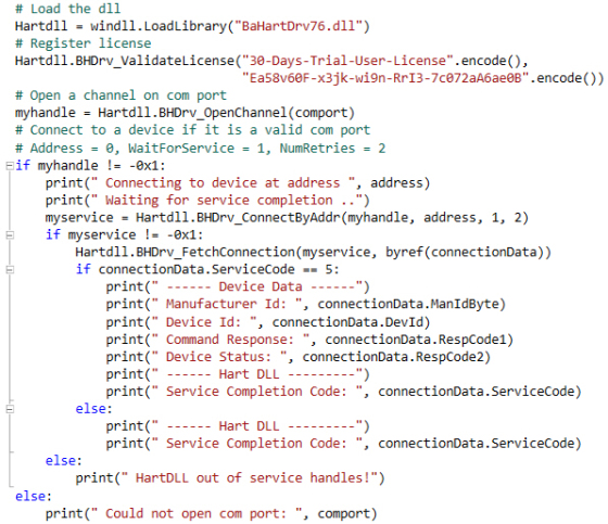I was impressed by how easily Python can be connected to other environments. You don't have to create any declarations to integrate a Windows DLL (e.g. BaHartDrv76.dll). The interpreter recognizes for himself what functions are included. You can easily make HART communication capable of real-time using the DLL mentioned and still integrate it into Python.